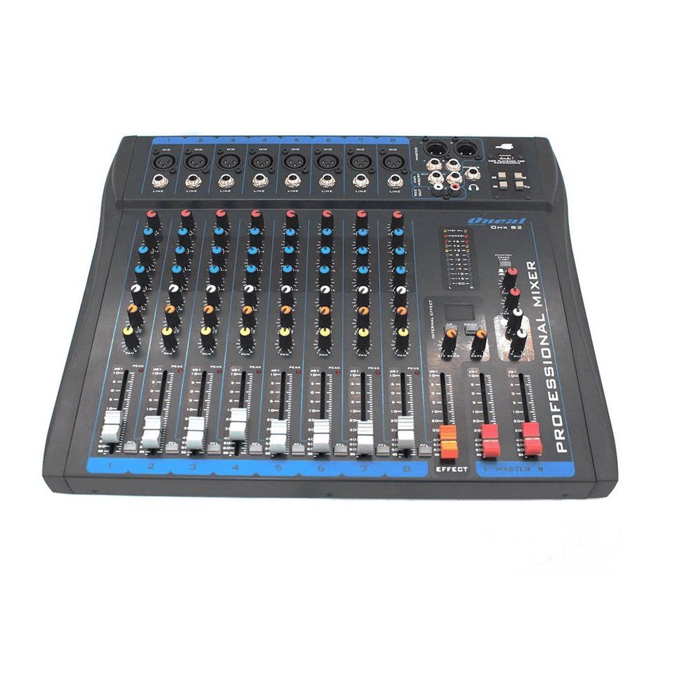 A Mesa de Som OMX-82, foi projetado dentro do que há de mais rigoroso e atual em componentes, medições e testes em áudio.8 Canais de Entrada BalanceadosControle de Ganho Microfone (gain)PANPFLEfeito DigitalControle Nível de Efeito (effect level)Controle de Repetição (REPEAT)DisplayEntrada USB Com Controle de Volume usbPhantom Power ( + 48V)Sensibilidade de entrada (mic): -80/36dB;Sensibilidade de entrada (line): -54dB/-10dB;Sensibilidade de entrada (effect): -20dB;Sensibilidade de entrada (Cd/DVD/MP3-4): -22dB;Nível de saída master máximo: 22dB;Nível de saída aux máximo: 20dB;Nível de saída Rec Out Máximo: -10dB;Potência de saída phones: 100mW/40 Ohms;Led Indicador de Saída de Pico (Peak): -3dB/17dB;Resposta de Frequência: 20Hz à 30KHz;Controle de Graves (low): 15dB 100Hz;Controle de Médios (mid): 15dB 2,5KHz;Controle de Agudos (high): 15dB 12Khz;Recurso pfl: Sim;Tensão de Rede Automática: 100V à 240VDimensões (Alt. XLarg. XProf. ) 50x410x355mmConsumo Máximo: 18W;Peso: 3,6Kg.1 Mesa de Som OMX-82 - 8 canais1 Manual de Instruções